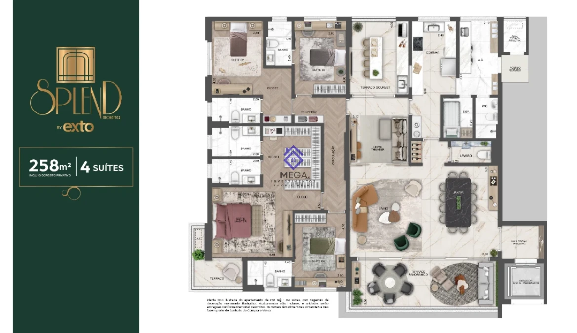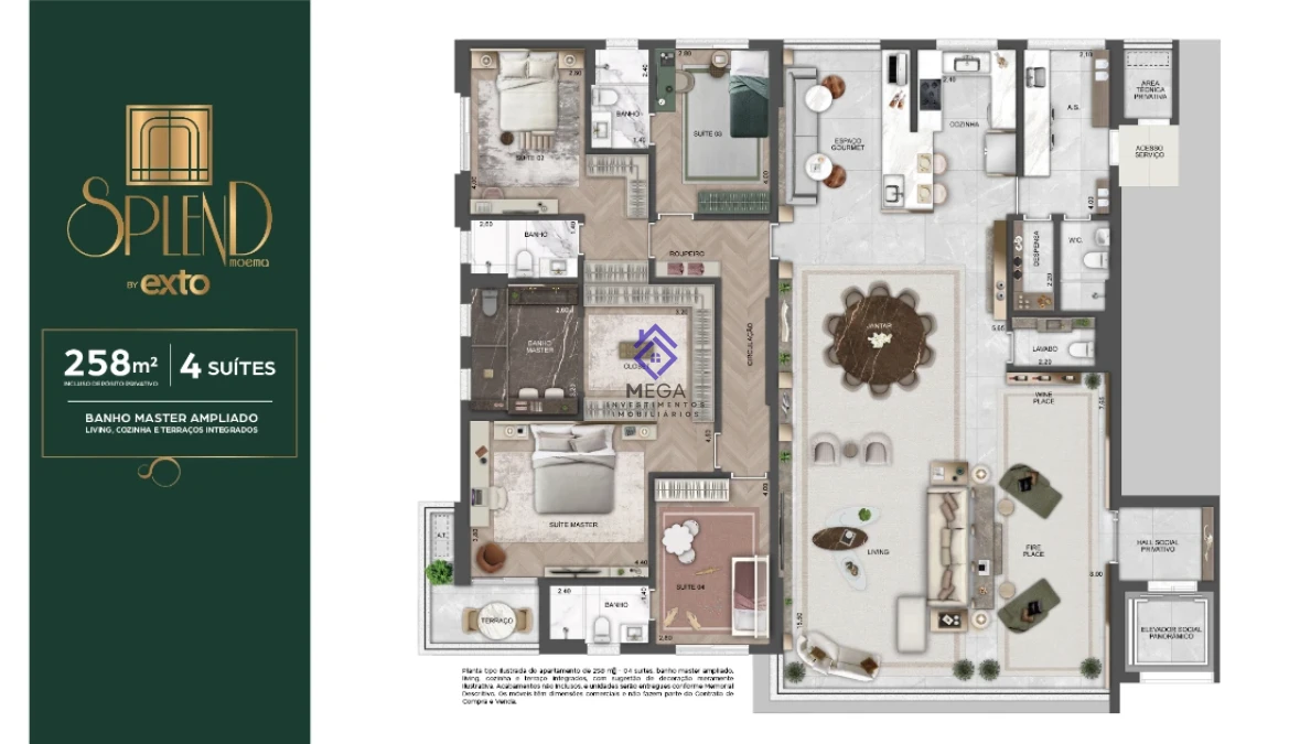 Apartamento 4 suítes em Moema, São Paulo com 258m². O imóvel possui ampla área privativa com quatro suítes completas, três vagas de garagem cobertas e acabamentos de alto padrão. O apartamento oferece layout funcional com ambientes integrados, proporcionando conforto e sofisticação para toda a família.